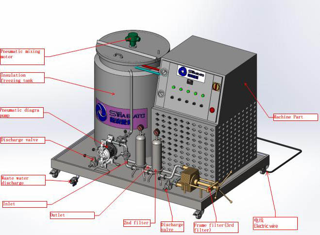 Mixing paddle and chilling coil; 1: Material contact part: SUS316L. 2: One machine realizes mixing, chilling and filtering functions. |